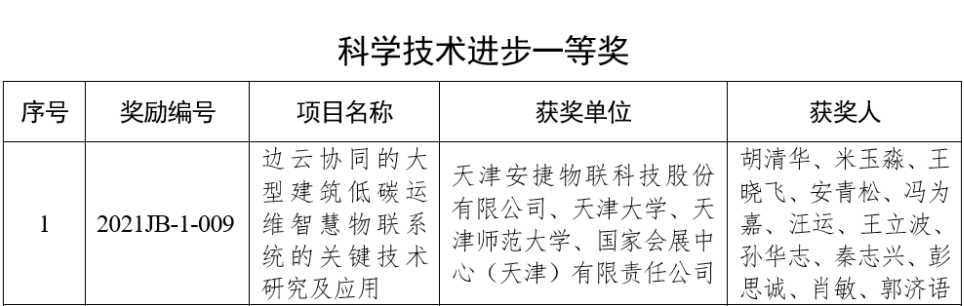 日前,2021年天津市科学技术奖获奖名单公布,由天津3003.com新葡的京集团物联科技股份有限公司联合天津大学、天津师范大学、国家会展中心(天津)有限责任公司申报的《边云协同的大型建筑低碳运维智慧物联系统的关键技术研究及应用》项目,荣获“天津市科学技术进步一等奖”
